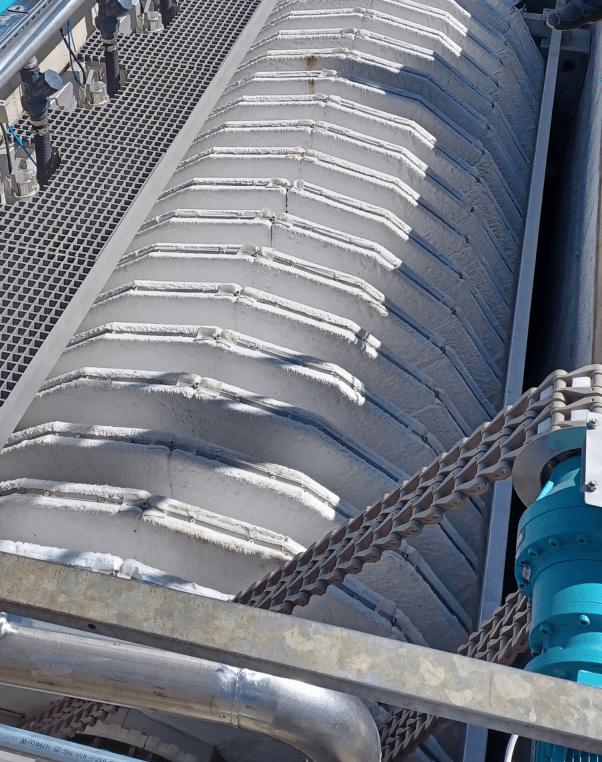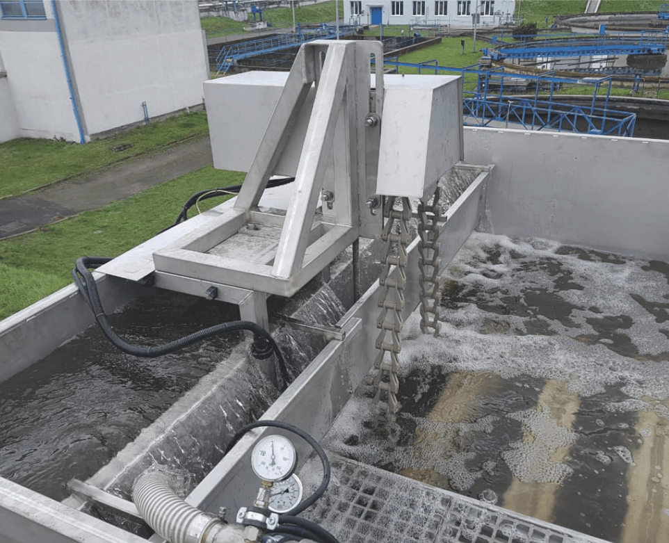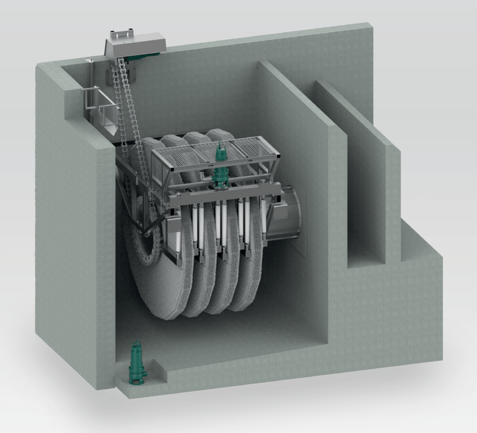 As the impurities get caught on the filter cloth, the flow decreases and the water level in the filter pit rises gradually. When the water level probe is activated, the filter discs start to rotate and initiate the cleaning process. This process involves slow rotation and suction of the impurities.